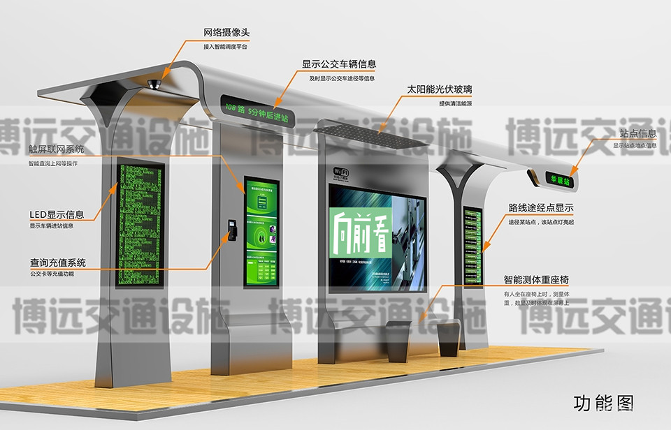 隨著城市化水平的深入推進(jìn),城市街具的重要性日益凸顯,公交候車亭、站牌在城市、鄉(xiāng)鎮(zhèn)及農(nóng)村的普及程度越來越高,城市基礎(chǔ)設(shè)施日益完善,江蘇博遠(yuǎn)交通設(shè)施未來的公交站牌、候車亭將向智能化、人性化、品質(zhì)化方向發(fā)展,電子站牌將逐步取代傳統(tǒng)的公交站牌。